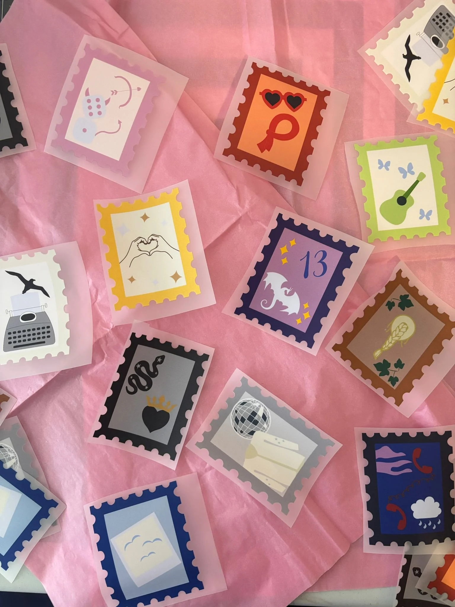 Each design blends minimalist line art and bold pops of color to match the album’s sleek, dreamy aesthetic. Stitch them on jackets, totes, patches, pillows, or gifts for your fellow Taylor fans!