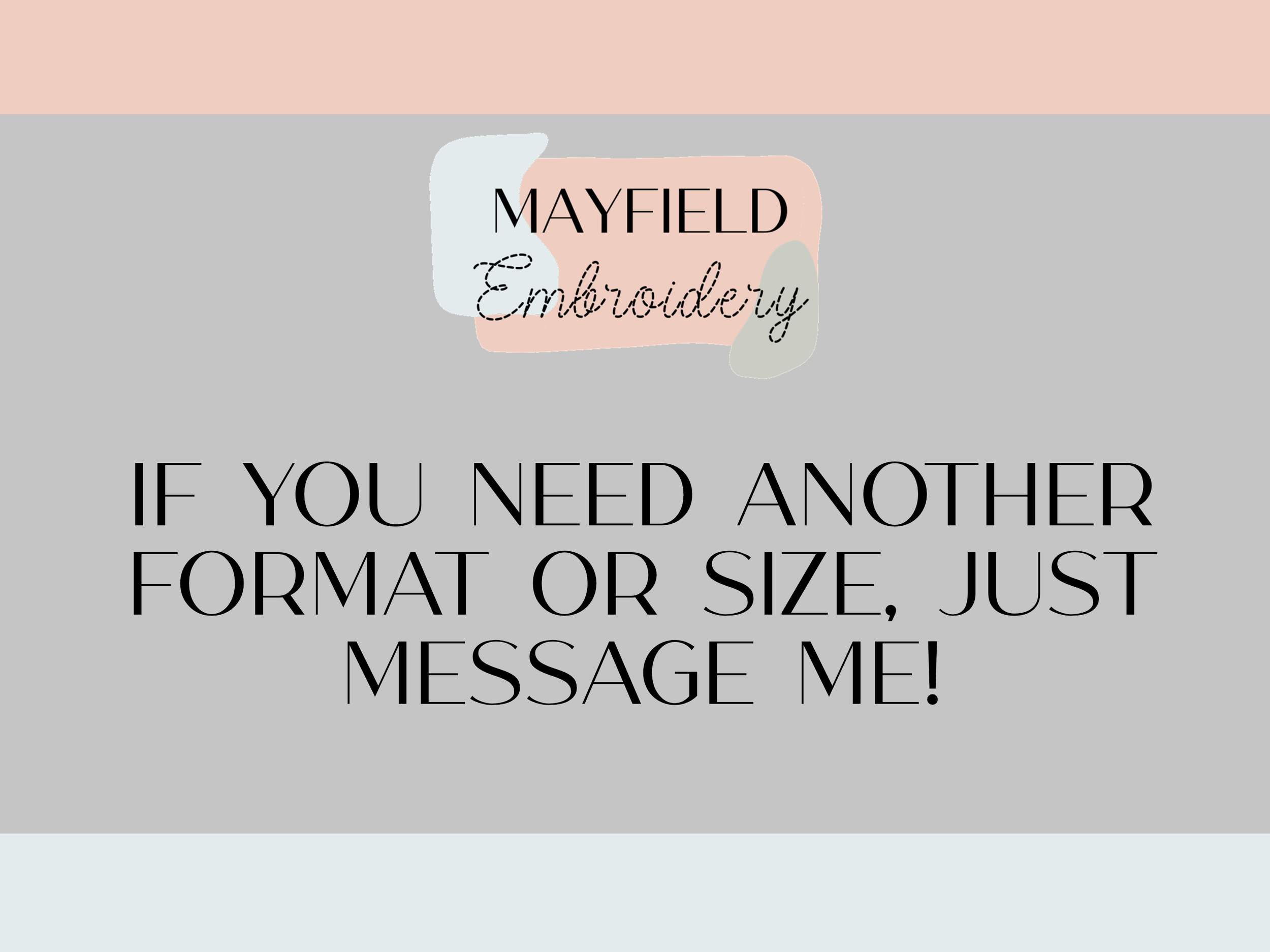 Please check the compatibility to your embroidery machine before purchasing. If you need a different file format than the ones listed, please contact me.